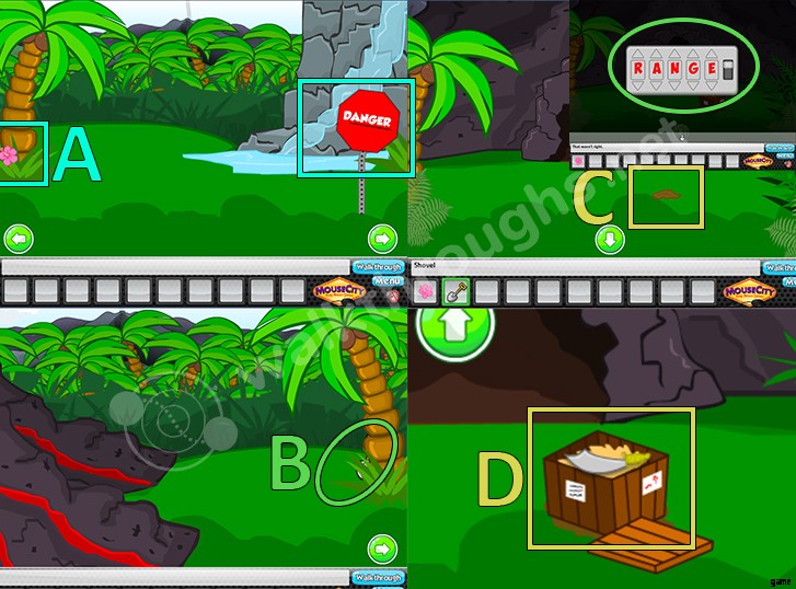 - 島の右側に行き、洞窟の入り口の階段を上ってください。 パズルを完成させるには、単語を RANGE に変更します。 (C)