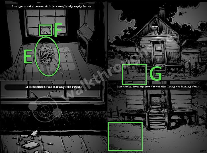 - 被害者の顔と腕をクリックします . 壊れたウィンドウをクリックします . 指紋ブラシを使用する 彼女の指紋を集めるために。 指紋ブラシ インベントリにあります . (E, F)