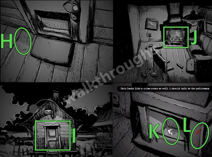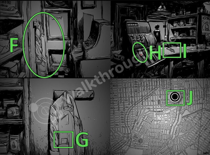 - レジで 魔法の鍵と血まみれのハンカチを取ります。 (H, I)