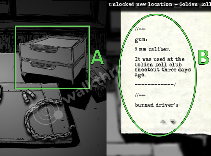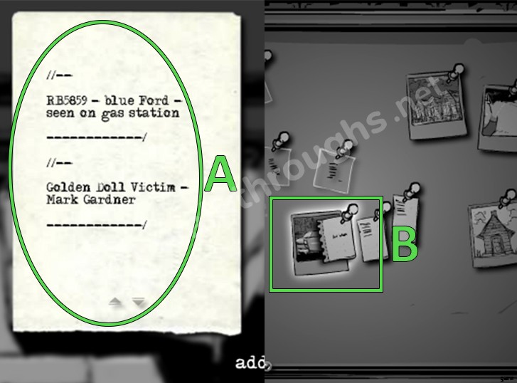 - 車の写真に車に関するメモをドラッグしてから、金人形の犠牲者のメモをドラッグします その上。 (B)