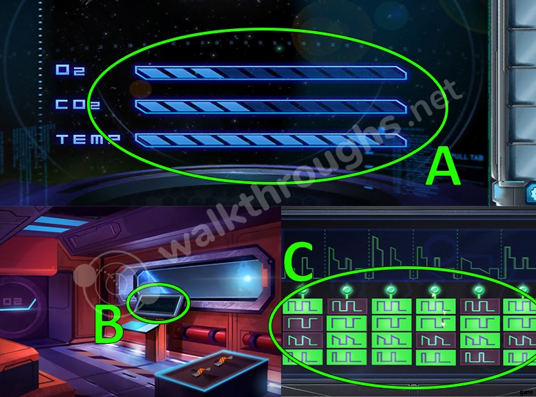 - ジェイクの宇宙服の設定を調整します。 O2、CO2、および温度を設定します 理想的なレベルに。 (A)