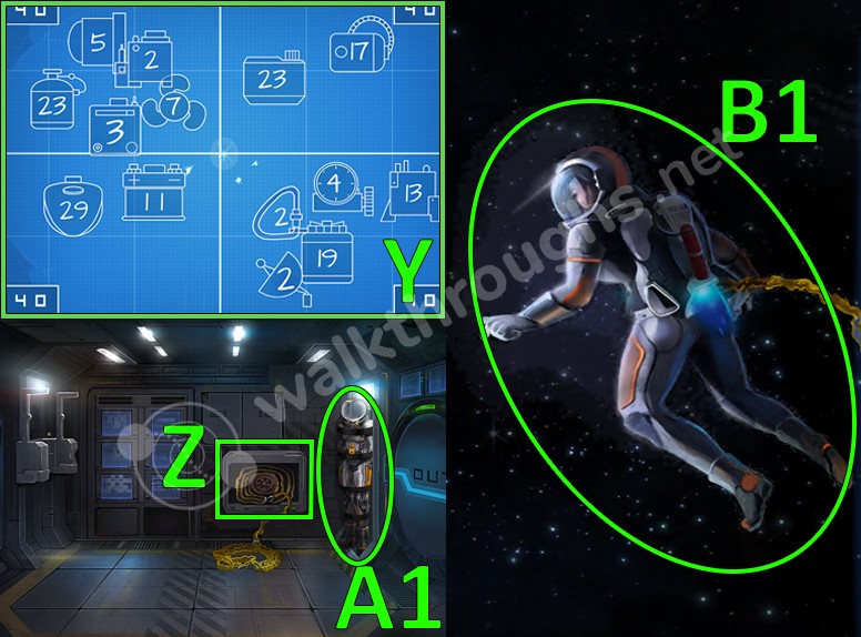 - 宇宙服を集める ジェイクの救出に向かいます 右のドアのそば。 (A1)