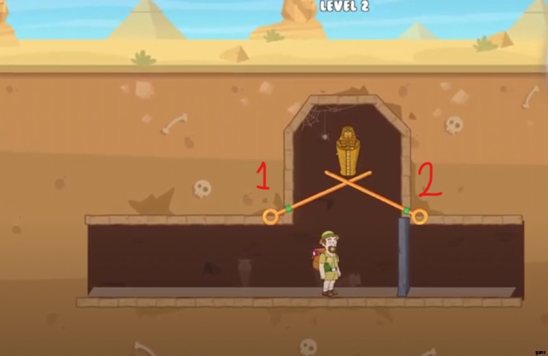 レベル 2 では、2 本の棒に挟まれたミイラ ケースにたどり着きます。あなたの最終的な目標は、キャラクターに落とさずに倒すことです。自分のキャラクターに当たった場合はゲームが終了し、最初からプレイする必要があります。したがって、指定された手順に従う必要があります: