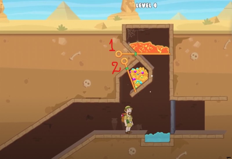 レベルが始まると、ハンターがトリッキーなパズルを解いていくのがわかります 、脇には沸騰する溶岩があります 、宝物 別の側に。 右手の棒を引いたほうがいい 画像で (1 )宝物と収集への道を開く それらすべてが次のレベルに移動します .