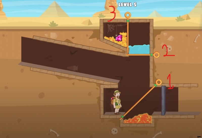 異なる場所に配置された 3 本のロッドがあり、それぞれに固有の障害物があり、そのうちの 1 本にはお宝が隠されている、エキサイティングなステージです。プレイを開始する前に、唯一の目的は富を集めて最後のステージまで生き残ることであることに注意してください。シーンを完成させるには、以下の手順に従ってください: