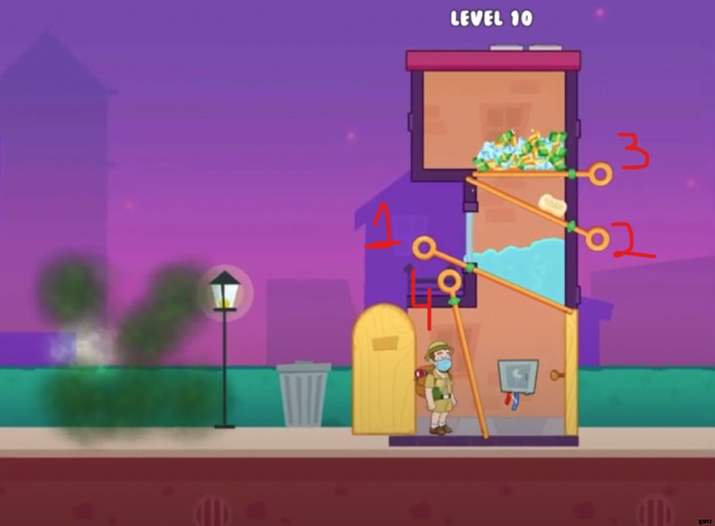 たくさんの現金を手に入れることができます。パズルを完成させようとしている間は、頭を使う必要があります。レベル 10 は、部屋を分割するために使用される 4 つの異なるロッドで構成されています。家に入ると、短絡に直面します。配電盤に水が落ちると危険なことはわかっているかもしれませんが、パズルを完成させるには、水を落とさなければなりません。火花を散らしている電気基板に向かって水の通り道を作り、2枚の石けんをスライドさせて泡を作ります。完了したら、3 番目のお金のロッドと、ハンターの直後の 4 番目のロッドを取り除くことができます。指定された手順に従うと、レベル 10 を完了するのに役立ちます。