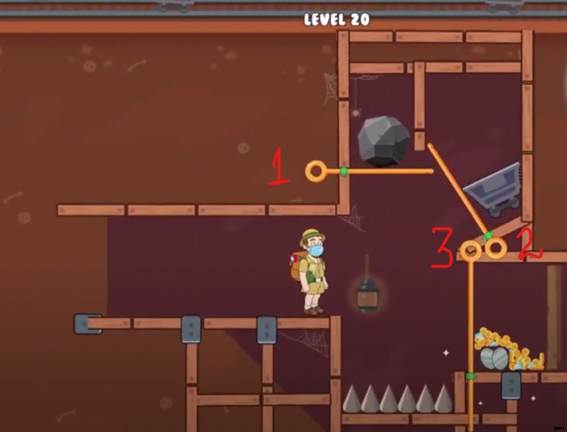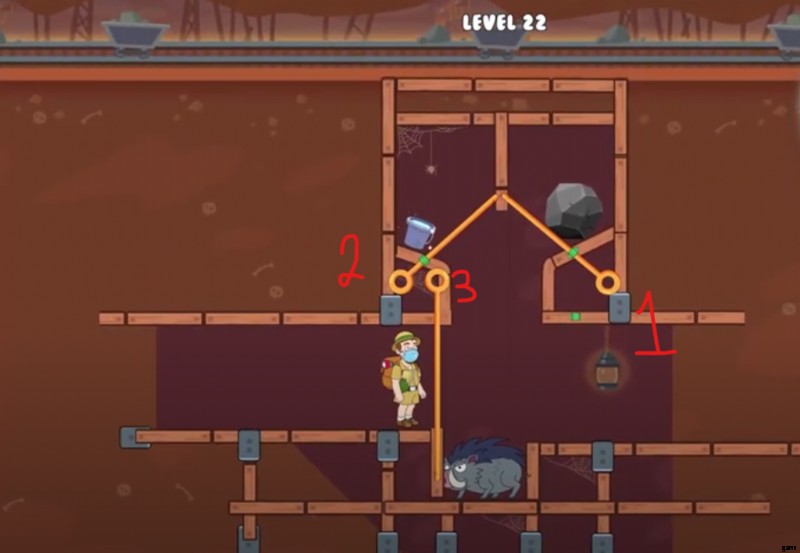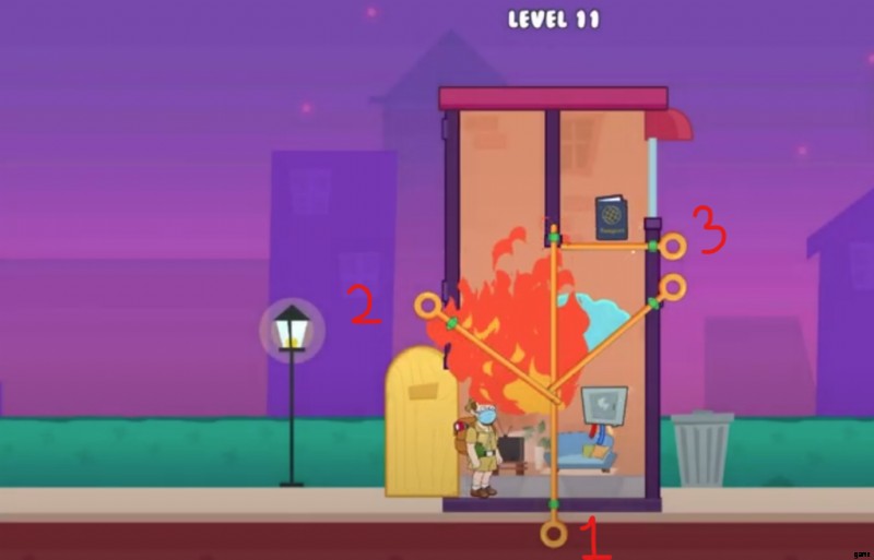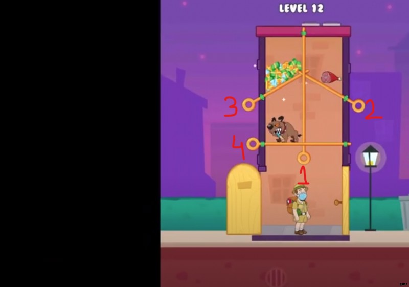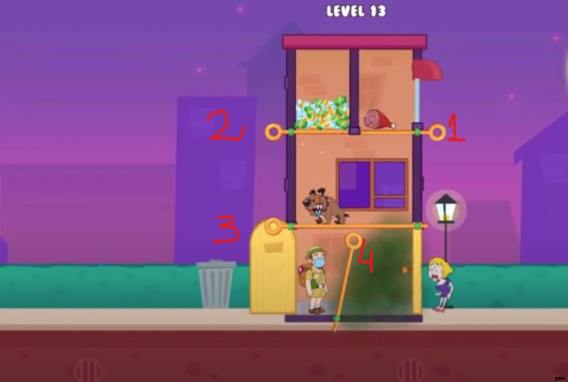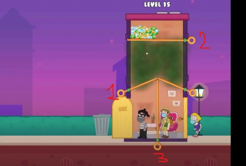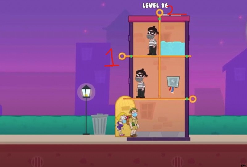 ゲームは、ロッドを使用して区切られたさまざまなセクションを含む、前のステージと同じ建物で行われます。ロッドを取り外してシーンを発生させ、パズルを完成させて次のステージに進む必要があります。 レベル 15 の彼を引き抜くを完了するには 、最初のロッドを引く必要があるため、毒ガスが降りてきて、あなたを襲う準備ができている泥棒を殺します。その後、2本目のお金を引いて目の前に落とします。お金を集めて次のレベルに進んでください。