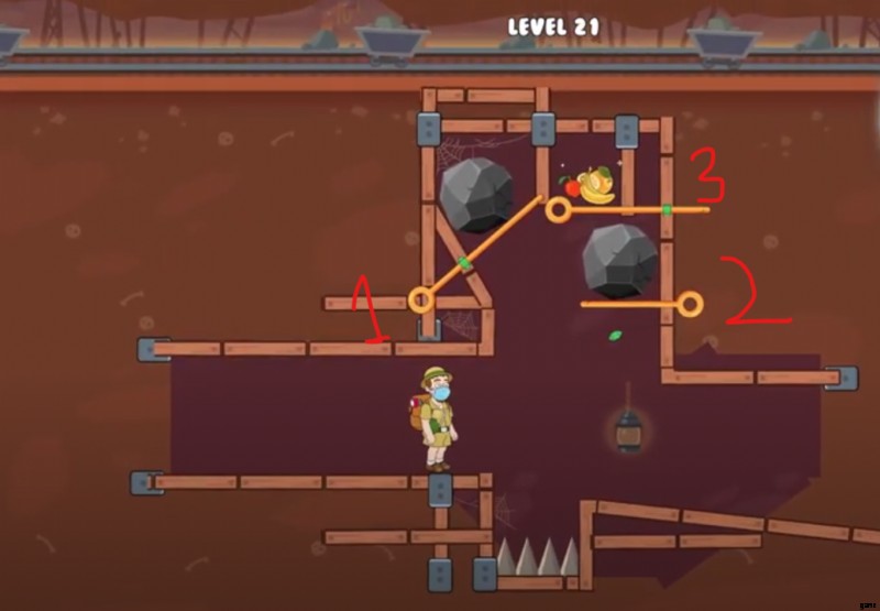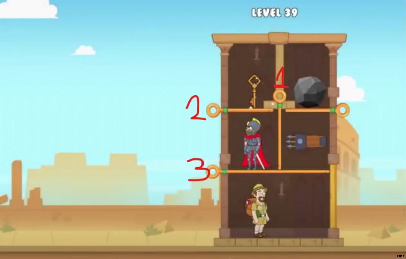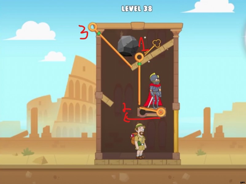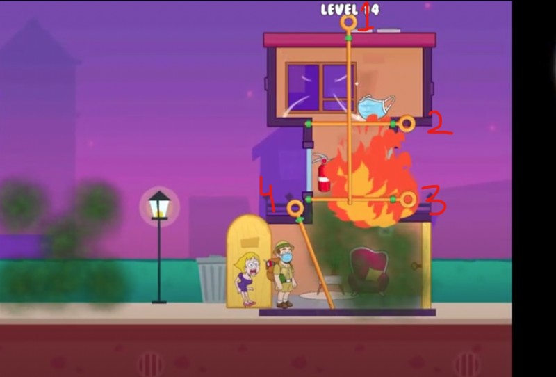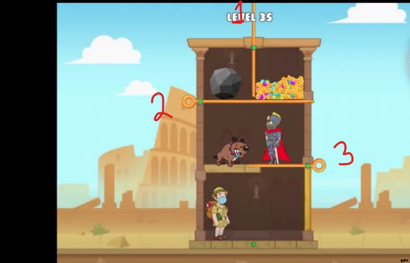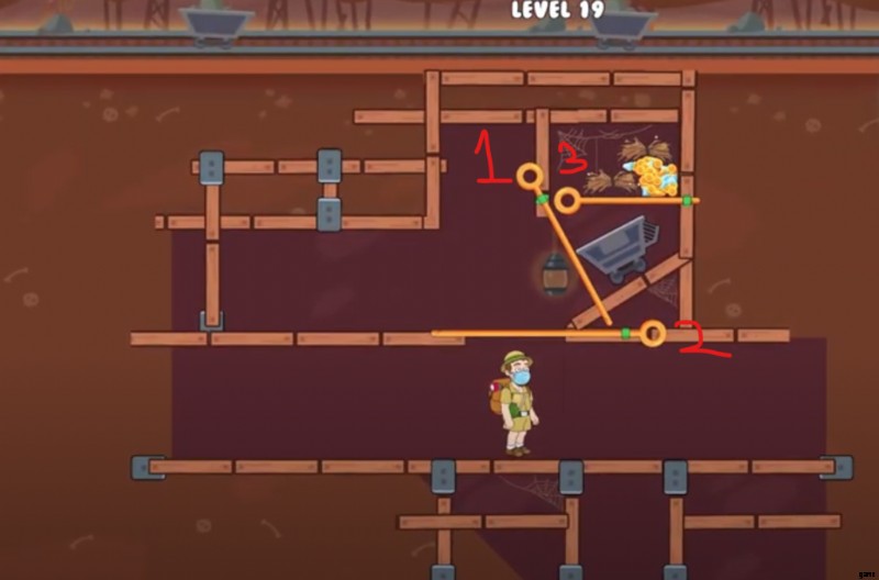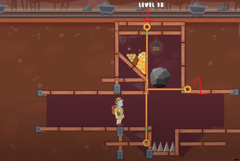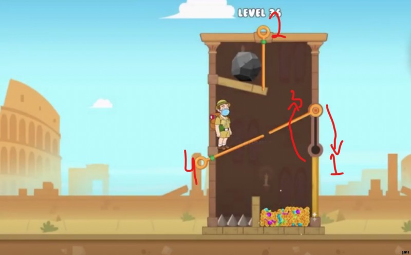 ゲームは、ロッドを使用して区切られたさまざまなセクションを含む、前のステージと同じ建物で行われます。ロッドを取り外してシーンを発生させ、パズルを完成させて次のステージに進む必要があります。 レベル 15 の彼を引き抜くを完了するには 、最初のロッドを引く必要があるため、毒ガスが降りてきて、あなたを襲う準備ができている泥棒を殺します。その後、2本目のお金を引いて目の前に落とします。お金を集めて次のレベルに進んでください。