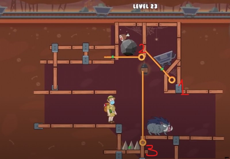 レベル 23 には、ワイルド ピッグ、ストーン、チキンのかけら、トロリー、スパイクなどのアイテムが含まれています。上記の手順に従って、プル ヒム アウト レベル 23 を完了します。 .