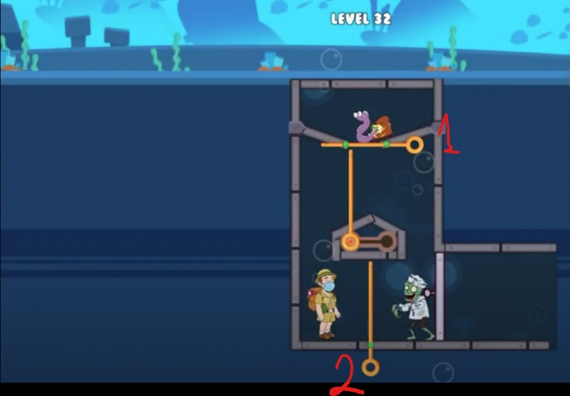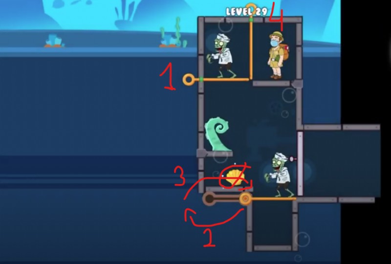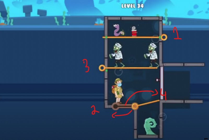 It’s a tricky level as you have to use the slider two times for the completion of the level. The level contains two vicious zombies wearing dirty clothes, an octopus, and a sea shell you required to open the secret door.