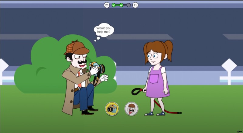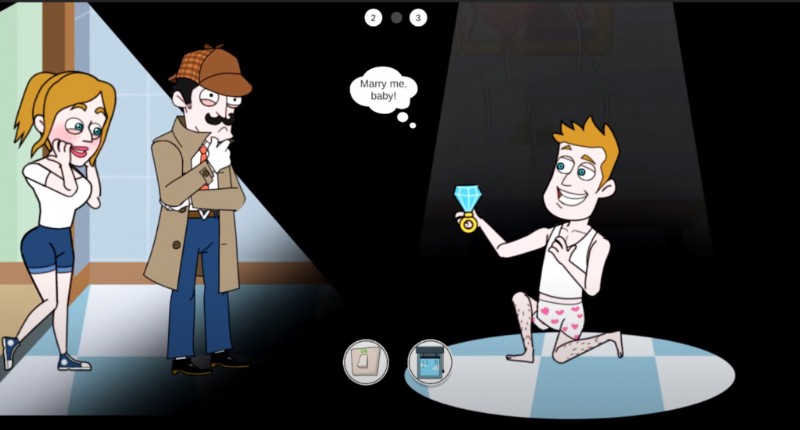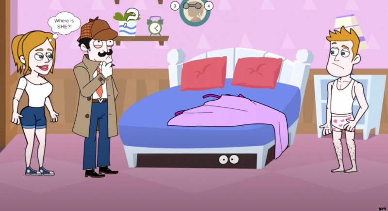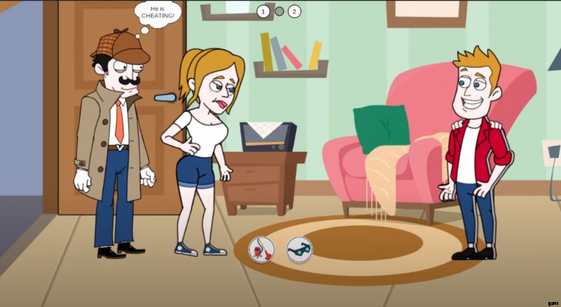 ゲームが始まると、容疑者と彼のガールフレンドの両方が部屋でロマンスをしているときに、誰かがドアをノックします。キャラクターがドアを開けると、彼の前に探偵と一緒に彼の妻がいます。検出とは、彼があなたをだましていると言っている.ここで、2 つの選択肢があり、シーンを進めるにはいずれかを選択する必要があります。 グーグルの選択 掃除機を選択している間にゲームが終了します 偽の服を明らかにするのに役立ちます 少年の。その直後、男の子は次のシーンに向かって走り、女の子とあなたの両方がすぐに手を差し伸べます.