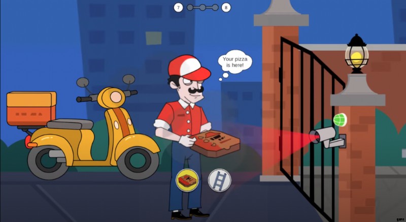 ドアの近くに到達すると、ドアが閉まっていることがわかり、はしごまたはピザの配達員から選択する必要があります。確かに、はしごを選択すると、セキュリティ警報システムに警告が発せられます。したがって、ピザの配達員になることは素晴らしいアイデアであり、大邸宅に簡単にアクセスできます.