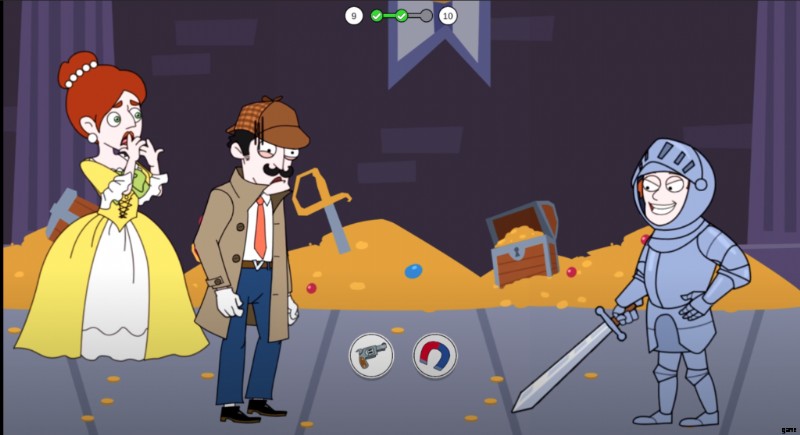 しばらくすると、アーマー スーツを着た庭師が現れます。 あなたの前に。 3 番目の事件を解決するには、どんな犠牲を払っても彼を倒さなければなりません ゲーム内の現金のために。今回は、Magnet などの 2 つのオプションがゲームに与えられます。 とガン .ご存知のように、箇条書き アーマースーツにダメージを与えることはできません。したがって、女王を許可します リモコンを使用するには 騎士を捕まえるために磁石をオンにします .最後に、あなたの探偵スキルを使って、殺人者を捕まえました