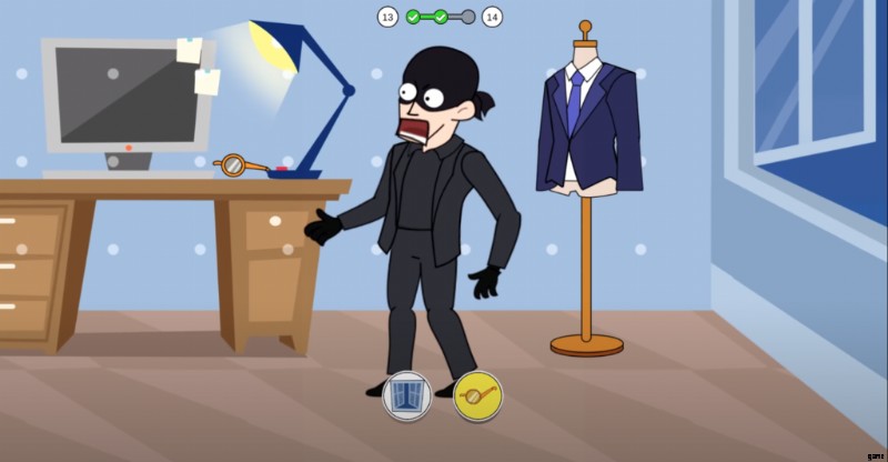 泥棒がたどり着いた部屋にはボスの洗練されたスーツがあり、彼は警察を克服するためにボスの起き上がりを適応させます。泥棒には、窓から逃げてボスの姿を現すという 2 つの選択肢があります。