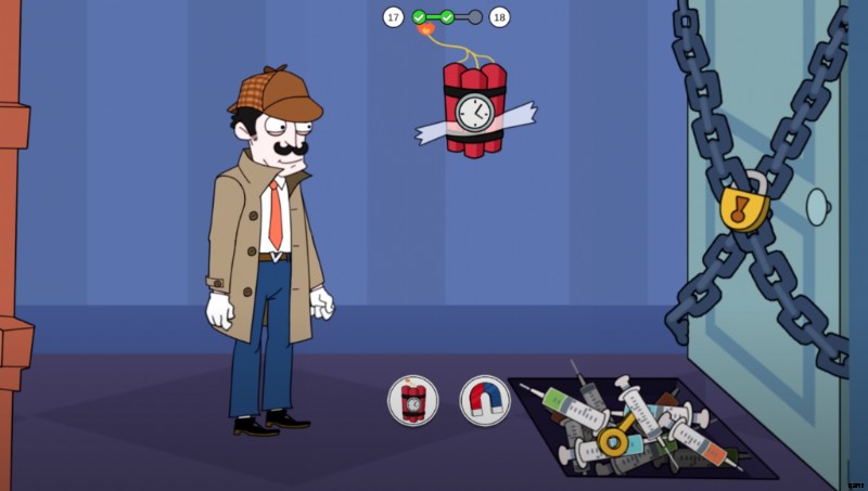 3 番目のシーンでは、はさみなど、2 つのオプションから選択できます そして野球のバット .あなたは爆弾処理班の出身ではありません;したがって、野球に行く 良い考えでしょう。指定された手順に従うことで、探偵として 2 つのケースを完了することができます。