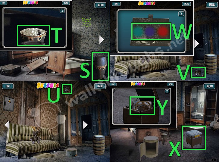 - 青、紫、赤の色を使用する 秘密の金庫を開けます。 フックを集める そして本。 (Y)