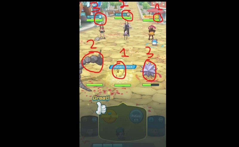 画面の下部に、ポーション (2/2) などの 2 つの異なるオプションが表示されます。 と サンダー ショック .確かに、サンダーショックはピカチュウ向けだろう .上記のボタンを押すと、モンスターのパワーがブーストされ、敵のメンバーを全力で攻撃してヘルスバーを使い果たすことができます. 「わざゲージ」があります 技を使うと減っていく。各キャラクターは自分のポケモンについて独自の理解を持っており、パワーを異なる方法で使用できます。したがって、誰かを攻撃する前に学ぶ必要があります。