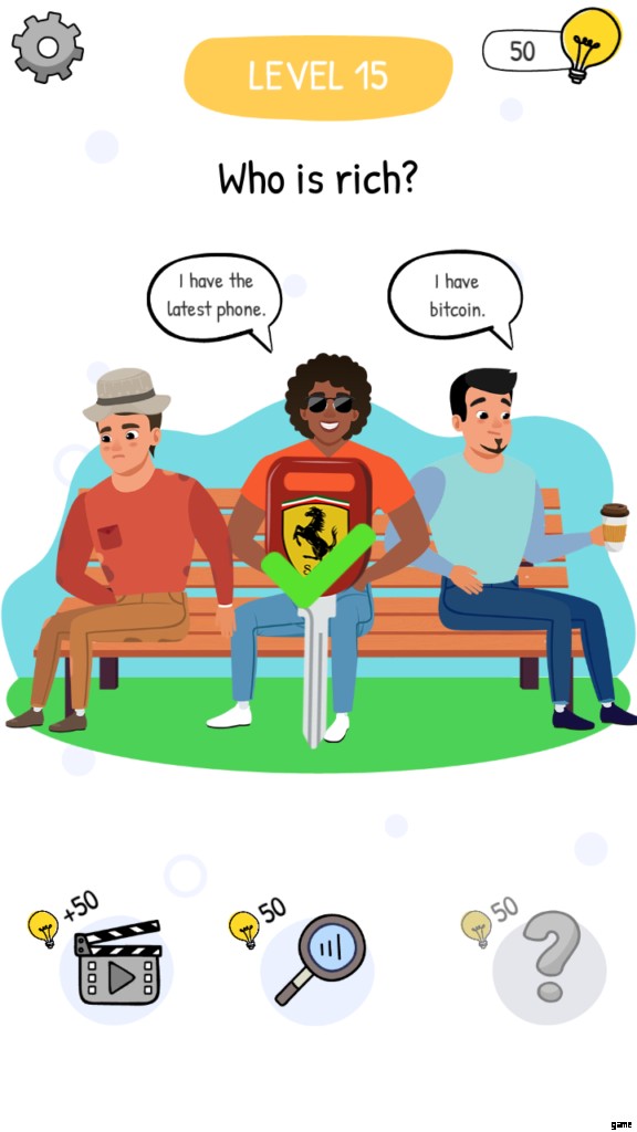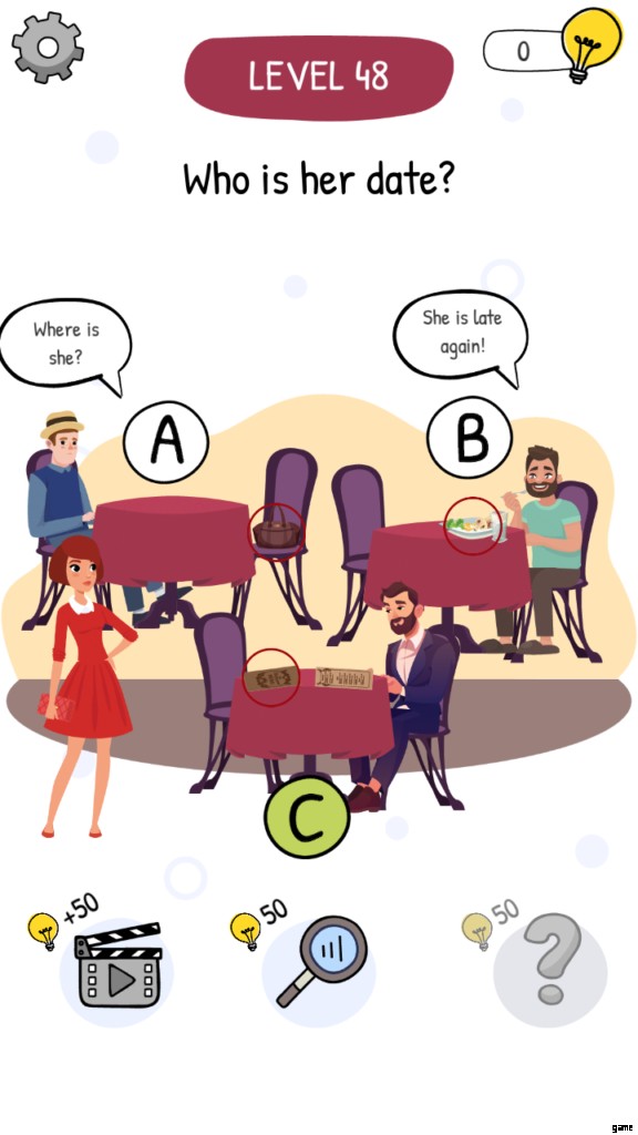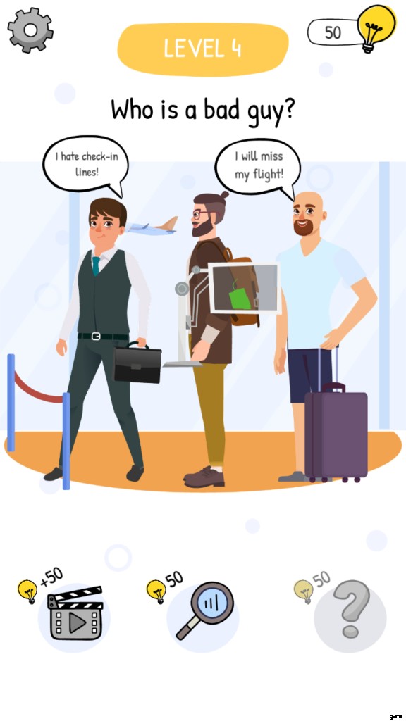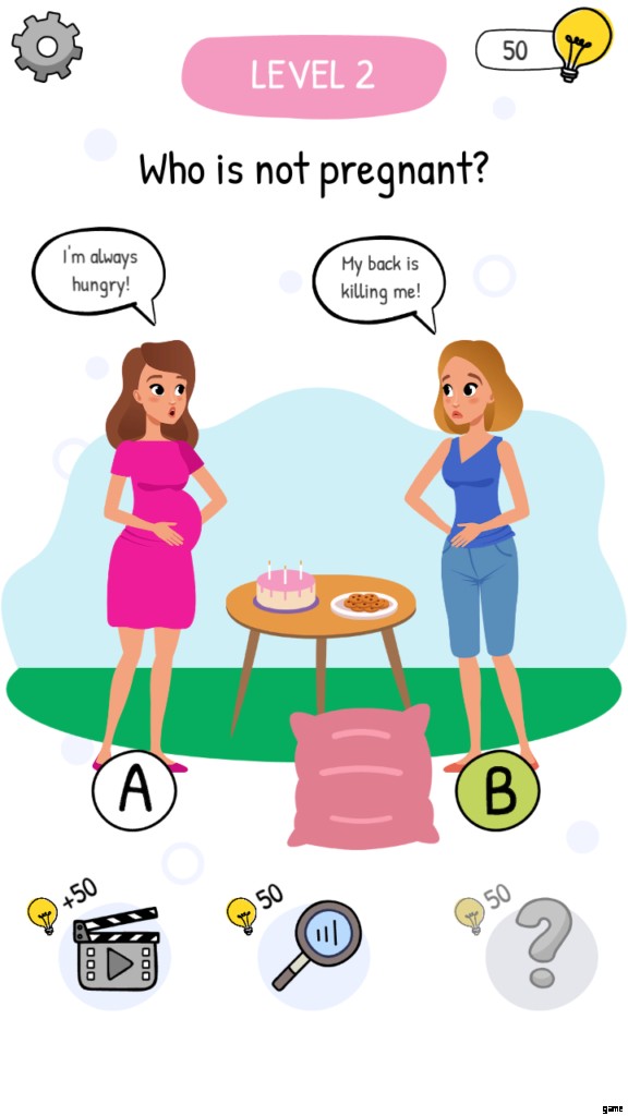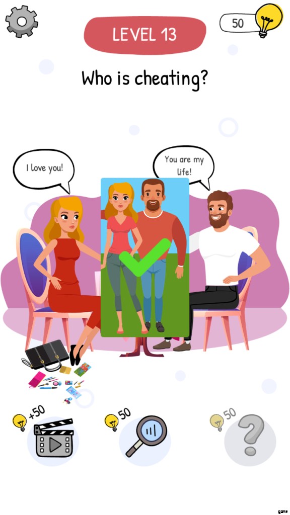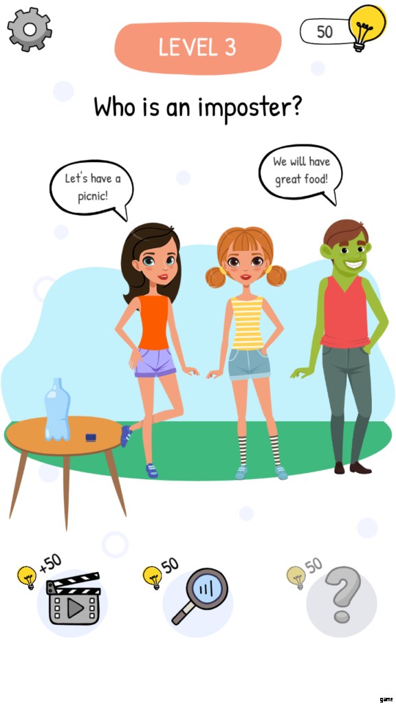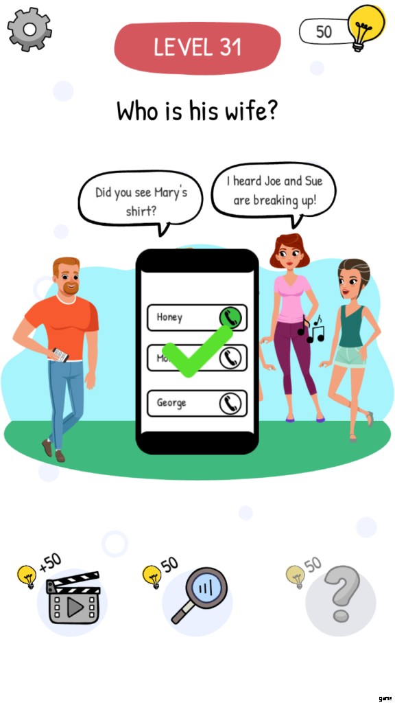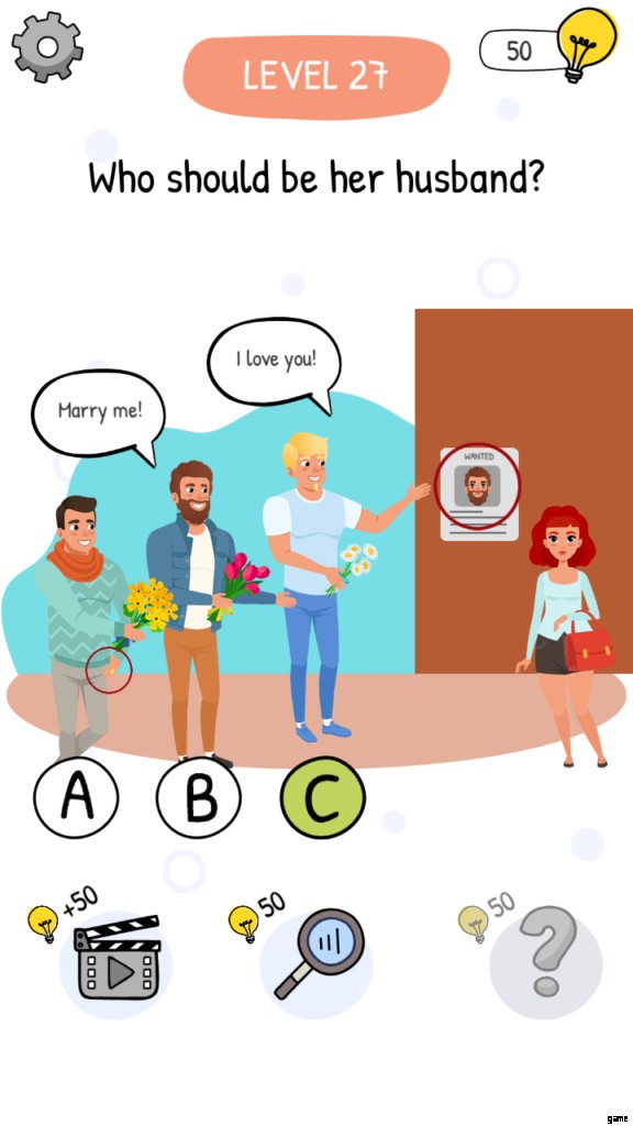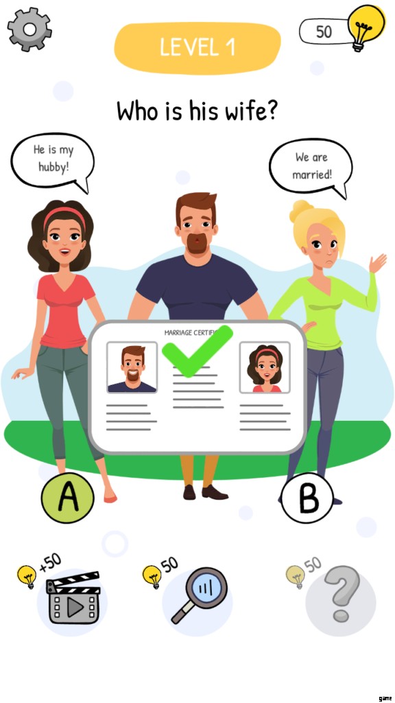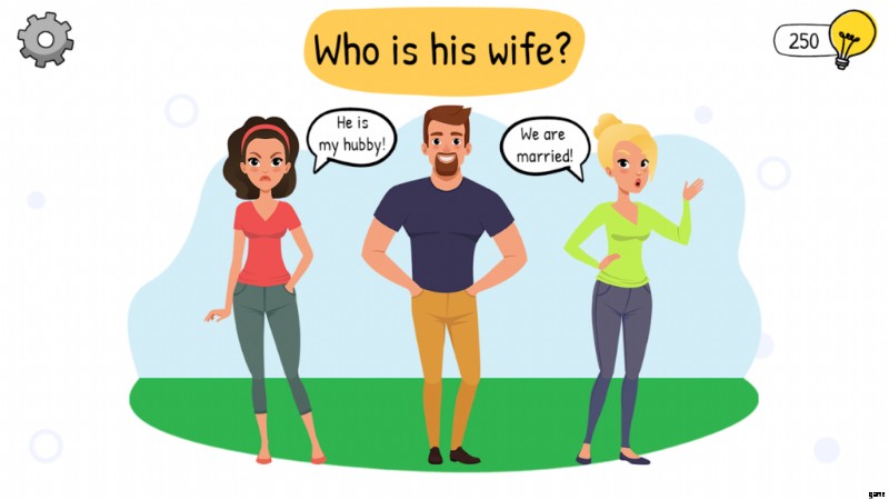 非常に興味深い質問で、誰もが答えたがります。このゲームは、パズルに関連するものを含む簡単なシーンを表示し、パズルに応じて 2 つまたは 3 つのオプションを提供します。最初のレベルでは、2 人の女性が立っているのは人間だと主張しています。さて、誰が真実を話しているかを明らかにするのはあなた次第です。あなたの質問は、「彼の妻は誰ですか?」 ?」ランダムな答えや推測は受け入れられません。したがって、探偵になって手がかりを見つけ、正しい答えを選択する必要があります。行き詰まった場合は、最大 50 ポイントのヒント システムがあります。答えは与えられた手順に従います: