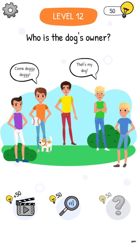 犬の飼い主は誰?次の質問はここです。ゲームは美しい公園に連れて行ってくれます。そこには犬と一緒に 5 人の男性が立ち始めます。質問が示すように、あなたの探偵スキルを使って、犬が属している男を見つけなければなりません。このゲームの特徴は、茂みの後ろにボールが隠されていることだけです。
