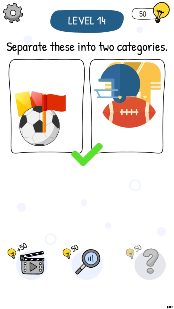 レベル 14 は非常に印象的で、2 つの異なるカテゴリのさまざまなものが用意されています。あなたの目標は、フットボールなどのカテゴリを念頭に置いて物を分けることです とサッカー .ゲームには 2 つの異なるボックスがあり、そこにあるカテゴリに関連するものをドラッグ アンド ドロップできます。最初のボックスはサッカー用です 2 番目のボックスは サッカー 用です .