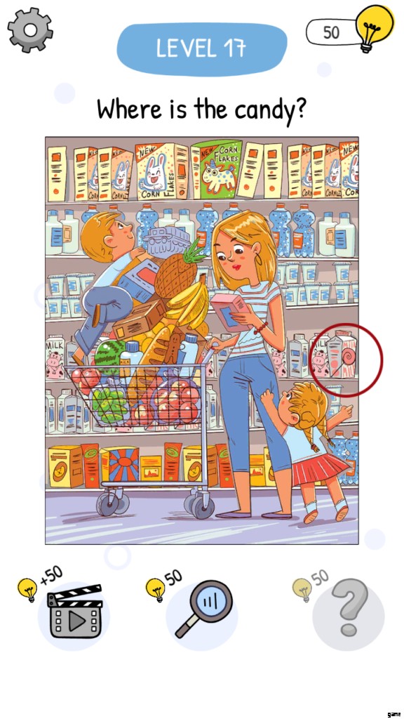 最も暗い部屋のどこかに隠されたキャンディーを見つける準備はできていますか?画面上に限られたオブジェクトを表示する丸みを帯びた形の円があるため、ゲームはトーチライトやろうそくのようなものを提供しません.画面上で円をドラッグして、そのアイテムを見つけます。円を画面上でドラッグすると、食料品店の母親と 2 人の子供が彼女に何か特別なものを選ばせていることがわかります。