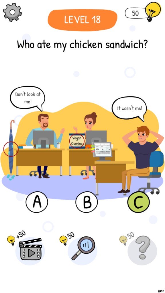 3 人のキャラクターがオフィスに座って生計を立てています。そのうちの 1 人は抑留者で、働き方を学ぶためにここに来ています。その間、誰かがチキン サンドイッチを食べてしまったので、あなたはその男を捕まえなければなりません。探偵としてのスキルを発揮して、事件を徹底的に調査し、犯人にたどり着く必要があります。