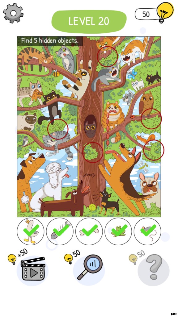 このゲームでは、5 つの隠しオブジェクトがあるはずの隠しオブジェクト レベルにあなたを歓迎します。非表示のオブジェクトは次のとおりです:マウス 、カエル 、骨 、魚 、アヒル .言及されたオブジェクトはすべて葉の中に戦略的に隠されているため、簡単に見つけることはできません.オブジェクトが見つからない場合は、以下の画像を使用してすべてのアイテムを見つけてください。