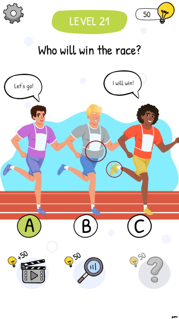 21 レベルでは、誰がレースに勝つかを確認する必要があります。 3 人のアスリートが、最初にフィニッシュ ラインを通過する人になるためにトーナメントで競い合っているようです。確かに、靴ひもと大きなお腹を開けていないプレーヤーにとっては、最も難しい作業になるでしょう。最初の 1 つだけが完璧に見え、彼はレースに勝つことができます。ゲームには 3 つの選択肢があります。A を選択します。 次のレベルのロックを解除するのに役立ちます。