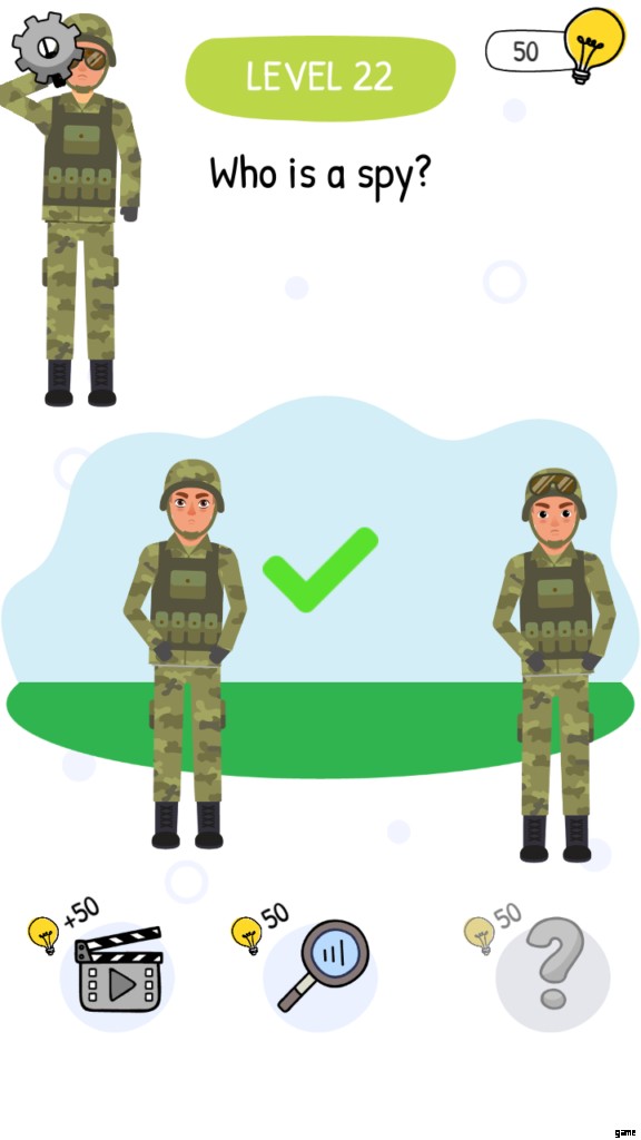 このゲームでは、画面に 3 人の兵士が登場し、スパイが誰であるかを明らかにします。 .すべての兵士は特別な兵士の衣装を着ており、誰が兵士であるかを決めることはできません.したがって、パズルを解くスキルを向上させたい場合は、ヒント システムではなく機知に頼る必要があります。レベルの解決策は、予想よりもかなり簡単です。画面の上部にある各兵士を連れて、スパイが誰であるかを明らかにします。