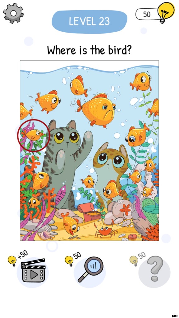 この段階では、鳥を見つけることになっています。このゲームは、さまざまな魚とその品種とともに水族館を発見する美しい環境にあなたを連れて行きます。このゲームでは、鳥を見つけるために丸みを帯びた形を与えながら、ほとんどの領域を暗く保ちます。レベル全体で円をドラッグして鳥を見つけ、そこで円を止めて次のレベルのロックを解除する必要があります。