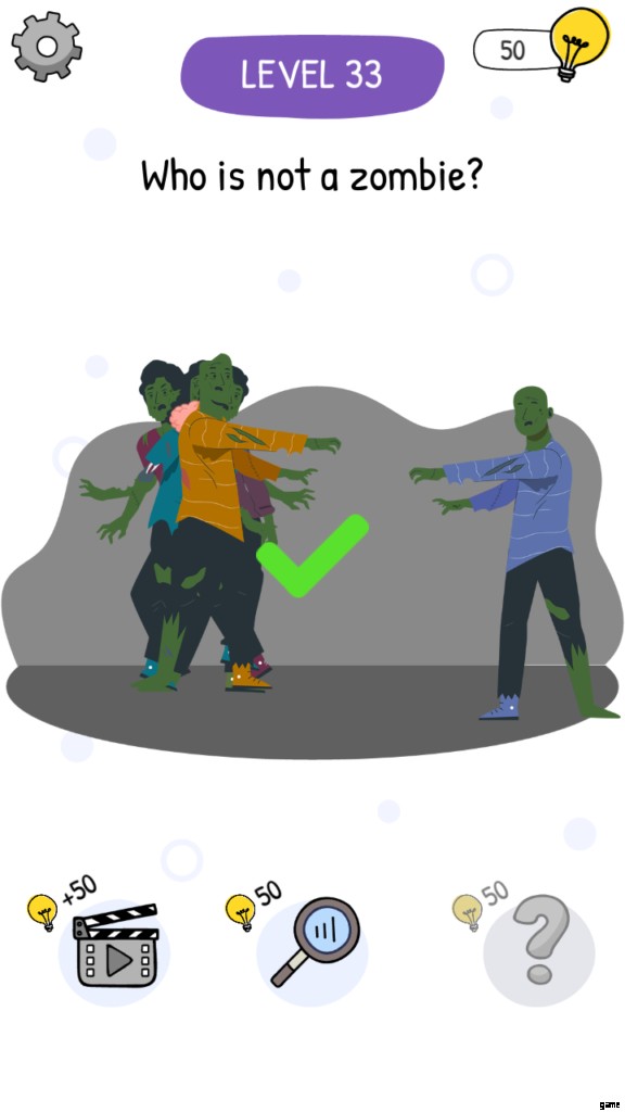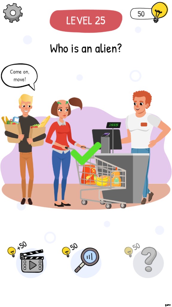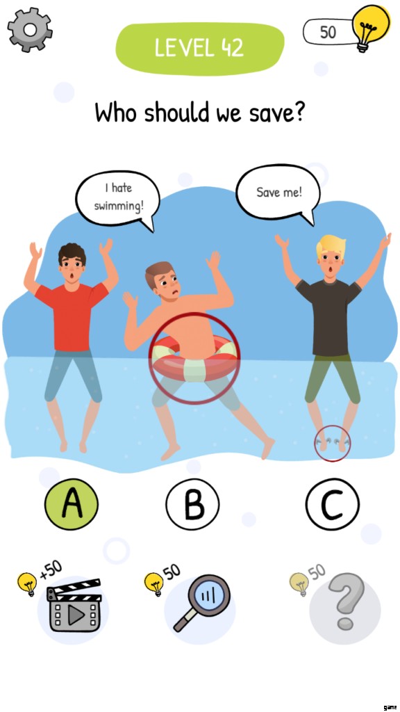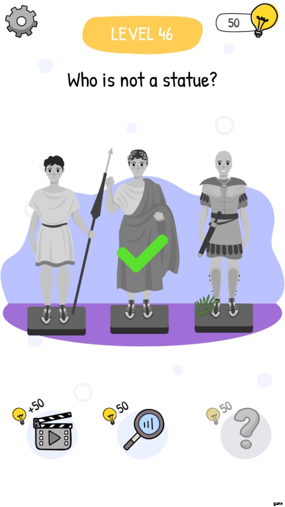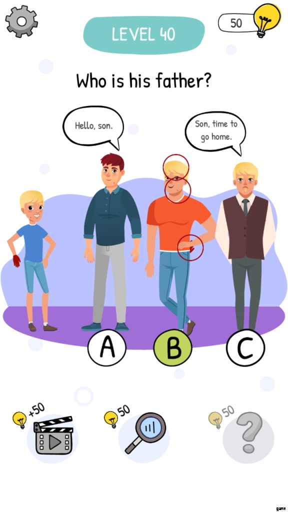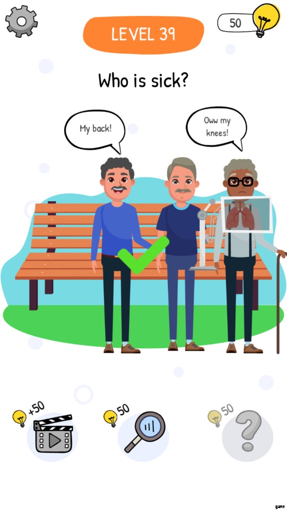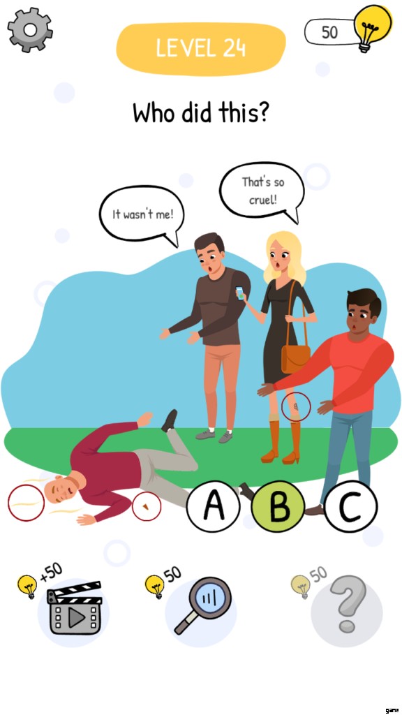 レベル 50 で、誰かが男の頭の上に石を投げたことに気付きます。石は男の隣にあり、これをした人を見つけることになっています.そこには腕を骨折した男性、子供を抱えた女性、子供など3人のキャラクターが立っています。子供と女には出来ないようだが、腕を骨折した男はどうだろう。パズルはトリッキーで、解決策はありません。ちょっと待って、男が腕を骨折したという誤った言い訳をしている可能性があることを見てみましょう.男性のハングから絆創膏または包帯をドラッグして、負傷していることを確認します。そうではなく、男が石を持っています。
