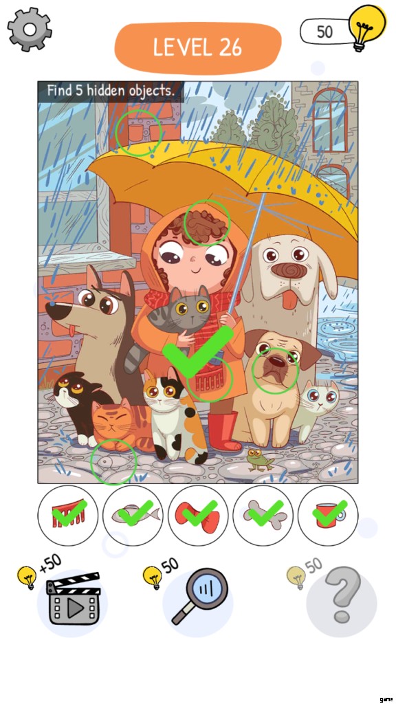 もう一度、ゲームによって美しいシーンに移動し、くし、魚などの 5 つの隠しオブジェクトを見つけます。 、骨 、スズ パック 、ネクタイ .たくさんの美しい子犬と子猫がいて、大雨からすべての動物を救うつもりで傘をさしているかわいい女の子もいます。すべてのオブジェクトを見つけることが必須であり、現在のレベルを完了しないと次のステージに進むことはできません。