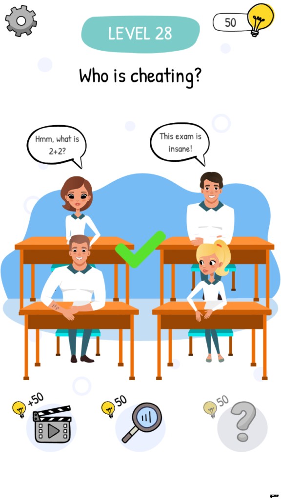 4 人の生徒が試験を行っている教室へようこそ。部屋で浮気をしている人を明らかにする手がかりを見つけることがあなたの目標であり、レベルを完了すると、次のステージのロックを解除する以外に何も残されません. 2 人の生徒が質問への回答を求めていますが、彼らは詐欺師ではありません。最初の生徒の腕をタップして、テストで使用するために彼が手に書いたものを明らかにします。