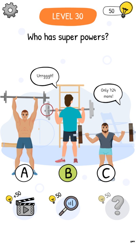 レベルが始まると、最大重量を持ち上げている人を見つけなければならないジムにいることに気づきます。見ると、三人目の男の方が二人より強いように見える。したがって、適切な男性を見つけるために徹底的に調査する必要があります。