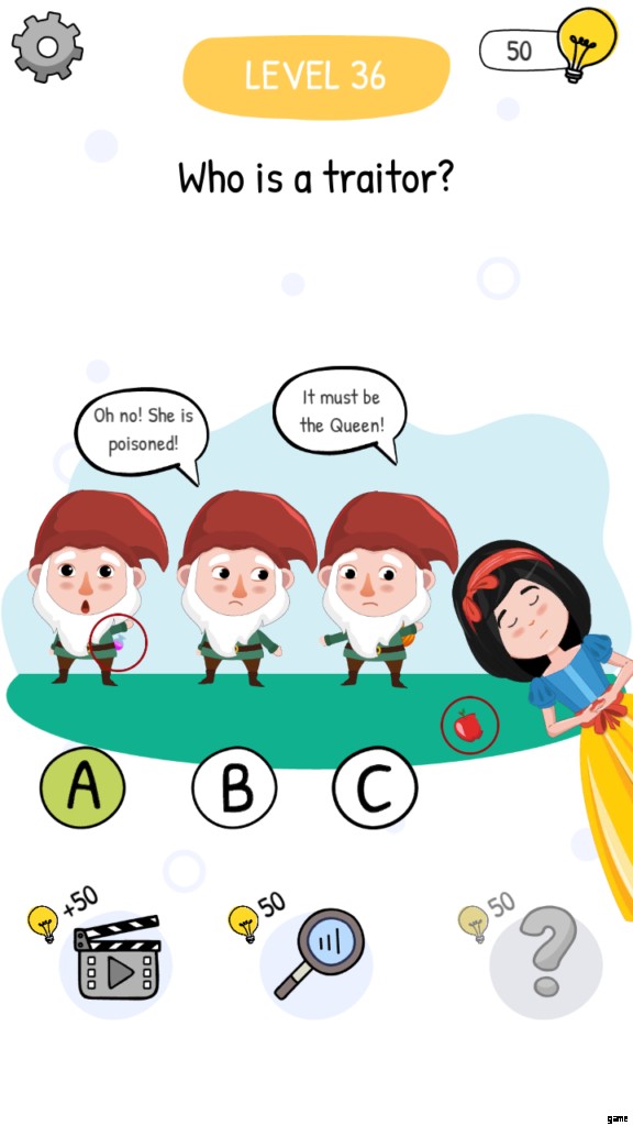 裏切り者は誰ですか?次の質問は、白雪姫に加えて 3 人の小さなキャラクターが登場するため、簡単ではないようです。 .キャラクターが隠したリンゴと毒の瓶があります。 タップ リンゴ そしてボトル 対象者を明らかにします。