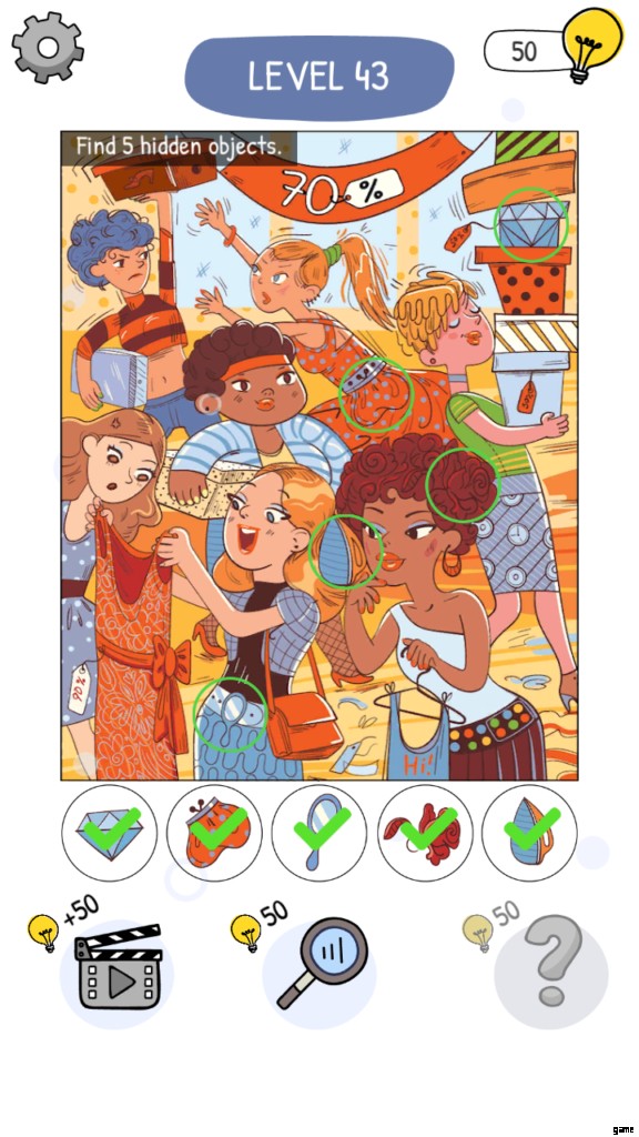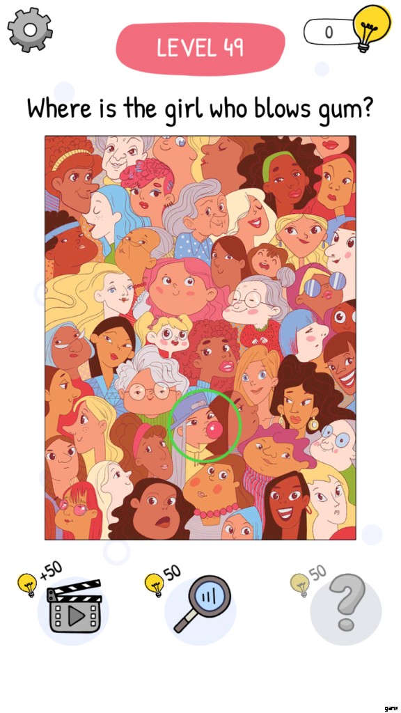 バブルガムを吹き飛ばしている女の子を見つけることがゲームの課題となるエキサイティングなレベル。ゲームには、高齢の女性や単一の部屋内の他の女性など、あまりにも多くの女の子が登場するため、その女の子を見つけるのは簡単ではありません。ライトの小さな部分をドラッグして、女の子の検索を開始します。
