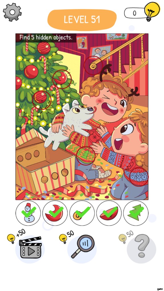 繰り返しになりますが、5 つの挑戦的な隠しオブジェクトを見つけようとしています。クリスマスが近づいているようです。今回は、ロリポップを見つけなければなりません 、雪だるま 、クリスマス 木 、赤 月 、ボウル .以下の画像では、すべての隠しオブジェクトが緑色の円で強調表示されています。