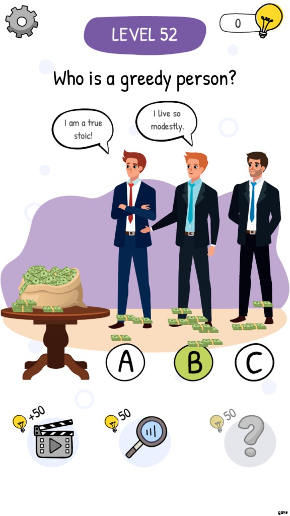 お金の入った袋がテーブルの上に置かれ、その前に 3 人が立っています。あなたは探偵のスキルを使って貪欲な人を見つけるために呼び出されます。確かに、現金でいっぱいのバッグを見た後、誰の口も水で満たされます。しかし、すべての指が同じというわけではありません。したがって、すべてのお金をすぐに手に入れたいという貪欲な人を捕まえることになっています。誰が貪欲かをテストするために、全員にお金を与えてください。
