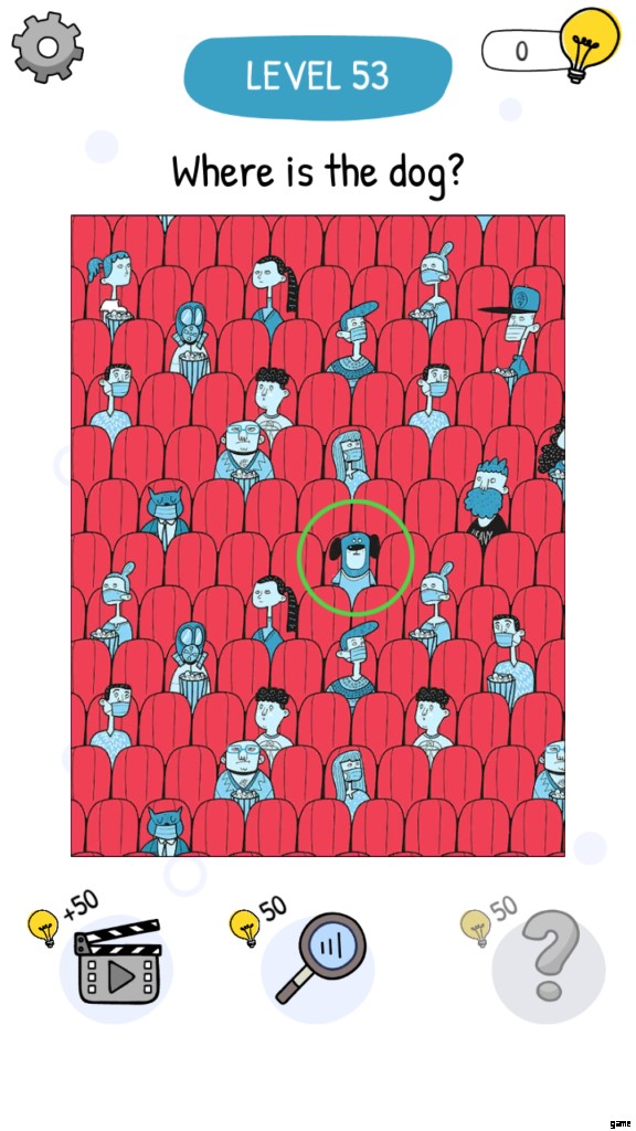 今回のゲームは、人々がお金を見て楽しんでいる映画館で行われます。このゲームでは、椅子に座っている犬を見つけます。小さなライトを画面上でドラッグして、犬を見つけてください。