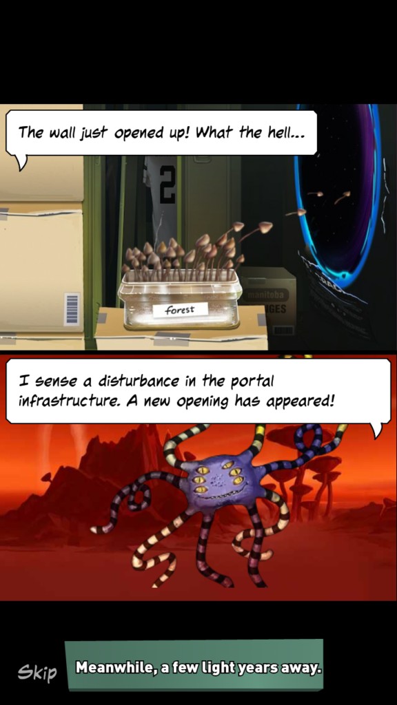 きのこの成長プロセスが完了するまでに最大 4 分かかりますが、水が不足していないことを確認する必要があります。所定の時間が経過し、キノコが完全に成長すると、壁の中にポータルが開きます。ポータルがあなたを何光年も離れた銀河へと導いてくれるようです。その隣には、地球上のキノコがおいしいので食べたいと話しているエイリアン同士の会話が表示されます。