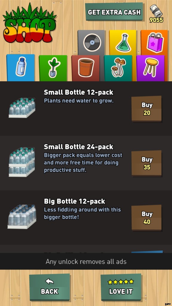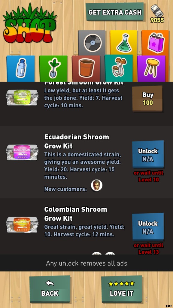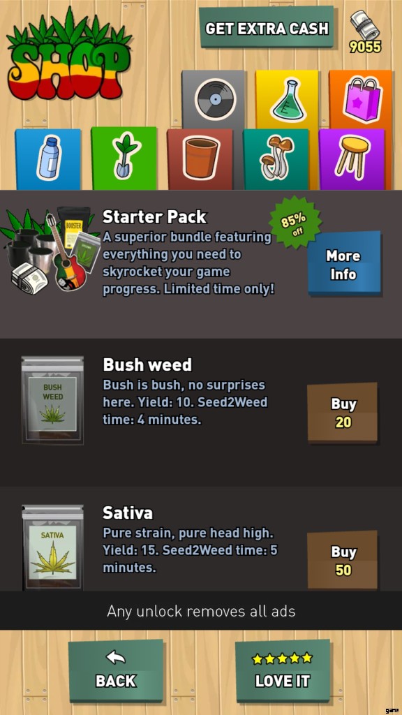 次のステップは、ゲーム内ショップから雑草を購入することです。他の人はロックされており、ロックを解除するにはいくつかの要件があるため、最初は、ビジネスを迅速に成長させるのに役立つのはブッシュウィードだけです. 雑草が完全に成長するには最大 4 分かかります .