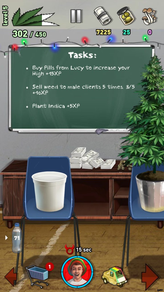 ゲームがボックスの上に表示するキノコの画像をタップすると、1つの高ポイントが差し引かれます.その隣には、そこから得たパケットを空にする必要があるポットがあり、注射を使用して薬を投与し、ポットのようにタイムリーに水を与え続けます。顧客がマリファナを手にするのを待っているゲームに戻りましょう。