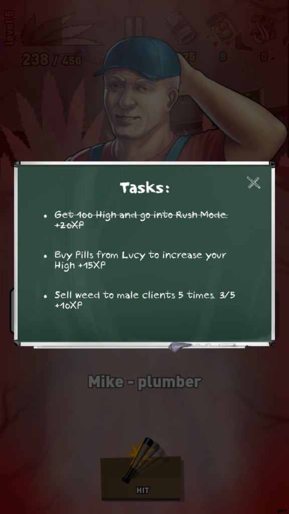 最初のタスクを完了するには、男性客を 5 回避けて、女性客だけに参加する必要があります。次に、2 つ目の目標は、各顧客から高いポイントを獲得することです。 1つの雑草を使用して、各顧客から最大+4高ポイントを獲得できることに注意してください.顧客があなたのドアに現れるたびに、それをタップして取引し、「ロールアジョイント」ボタンをクリックして、前述の高ポイントを獲得します。その後、クライアントの雑草を高値で売却。ゲームには 47 を超えるレベルがあり、各レベルには一連のタスクが用意されています。
