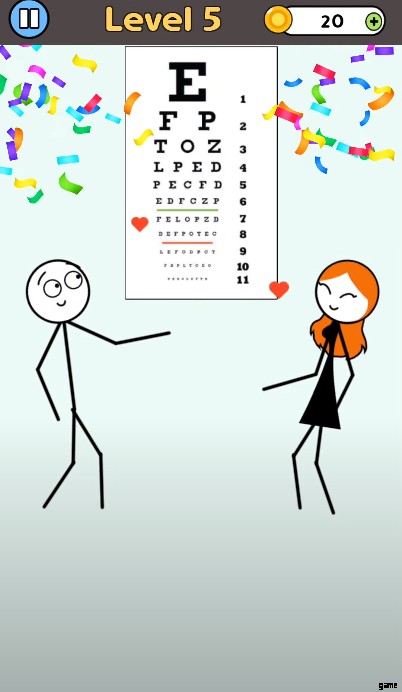 各パズルを完了すると、ヒントに使用できる 5 つのゲーム内コインが残る場合があります。ゲームの要件は非常にシンプルなグラフィックですが、ゲームには高度な視覚効果はありません。少女は棒人間を眼科医に連れて行き、視力をチェックしました。あなたのキャラクターは視力が弱いわけではないようです。したがって、メガネを外して、彼が先のすべてを見ることができるようにする必要があります。