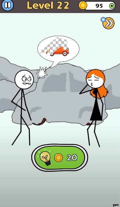 少年は、頬にキスマークがあるため、巨大な石の後ろに隠れています。女の子は怒った気分で、質問に答えないと男の子を殺すかもしれません。したがって、棒人間の頬から記号を削除して、両方のキャラクターを互いに近づける必要があります.