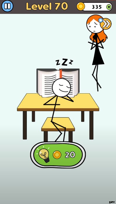 The stickman is sleeping behind the book, while the female character considers he is reading the book. The game tasks you with erasing the book to reveal the character ahead of you, the teacher. The teacher will shout at the stickman for playing a cheap trick within the classroom. The game will unlock further challenging levels as you complete chapter seven. As mentioned above the game has over 10 chapters to play; each one is offering ten levels to complete.