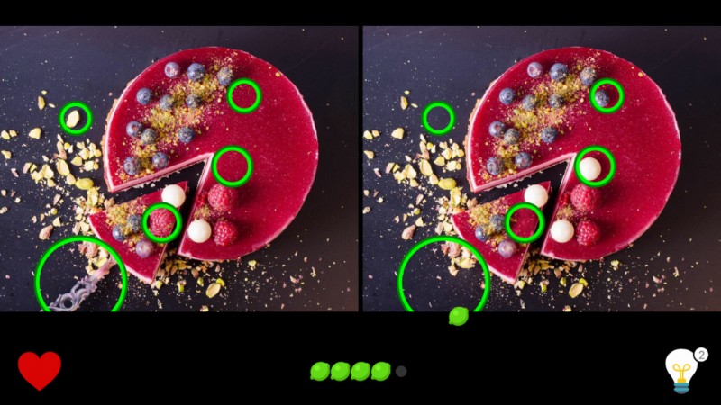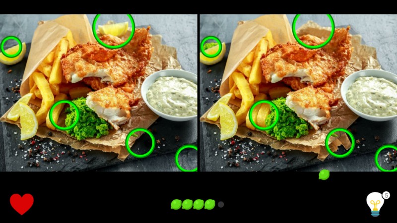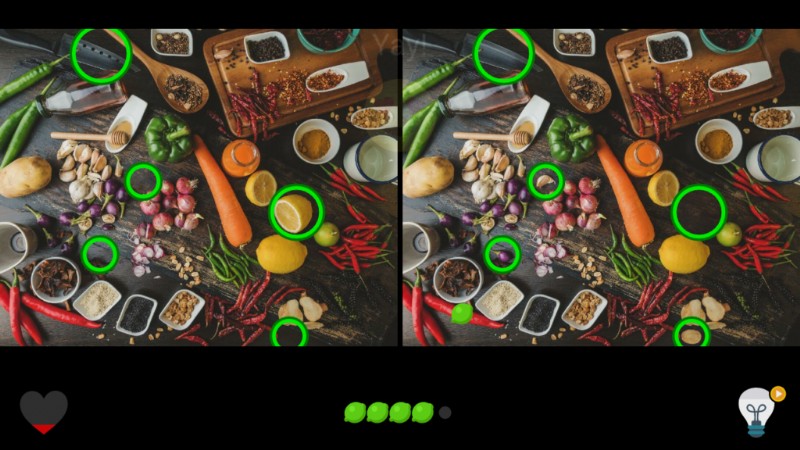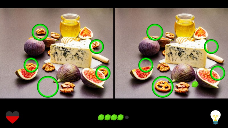 ドライフルーツ、野菜、チーズ、蜂蜜の瓶をほぼカバーする美しいイメージ。あなたの目標は、時間のプレッシャーなしにどんな犠牲を払っても 5 つの違いを見つけることですが、画面をランダムにタップして隠されたスポットを強調表示することはできません。