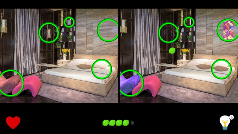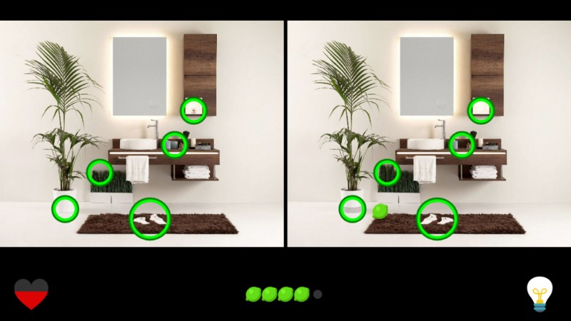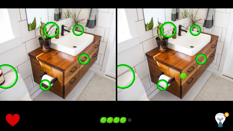 ゲームは、限られた物や家具を収めた美しい部屋の画像を表示します。植木鉢、化粧台、敷物、洗面台にあるいくつかのものを見つける化粧室のようです.あなたの目標は、時間のプレッシャーなしに 2 つの画像の 5 つの違いを見つけることですが、ゲームプレイに影響を与えてゲームを終了させるため、画面をランダムにタップすることは許可されていません。
