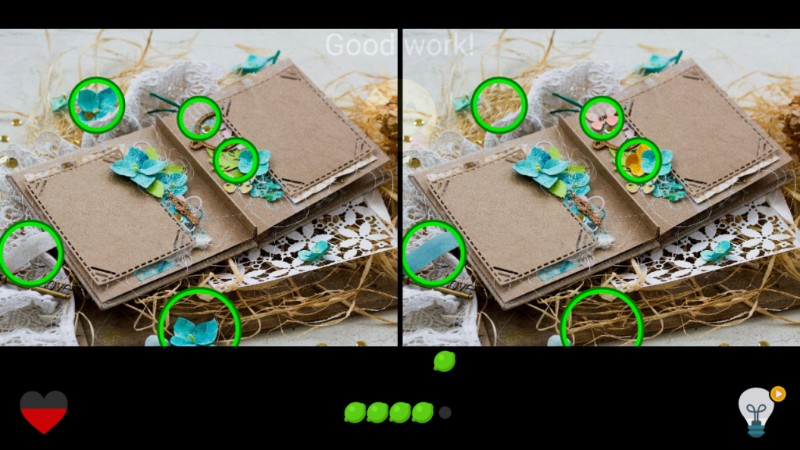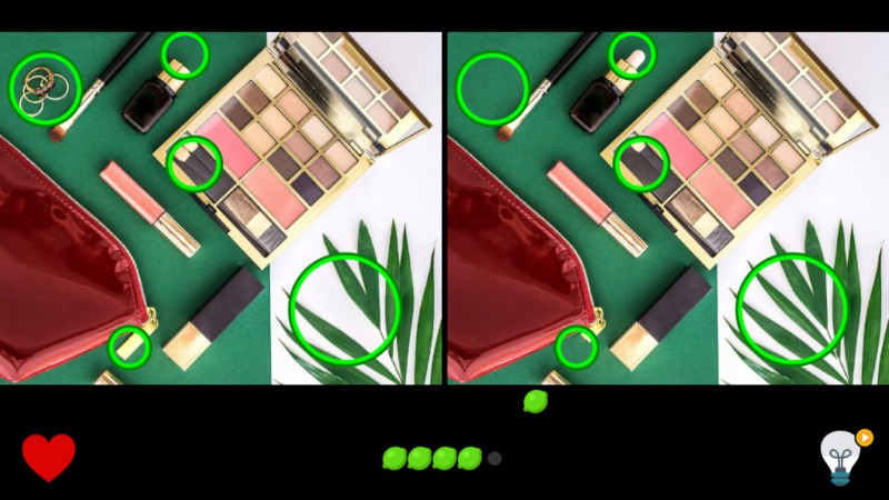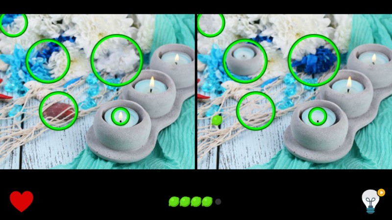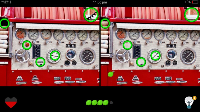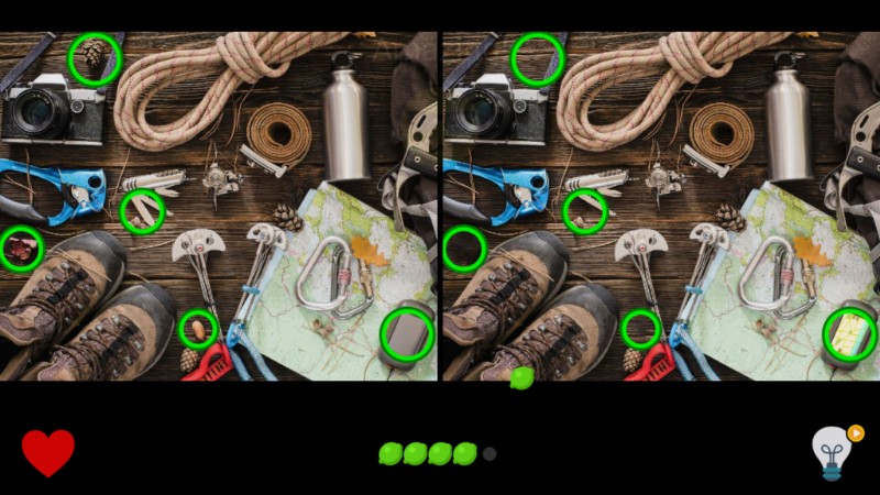 違いを見つけよう 1000+ レベルは、左側にハートマーク、右側に電球があります。画面上で無効なタップを行うと、ハート バーがなくなり、ゼロになるとレベルが終了します。ヒントは期間限定で使えます。それにもかかわらず、広告を見て無料のヒントを得ることができます。