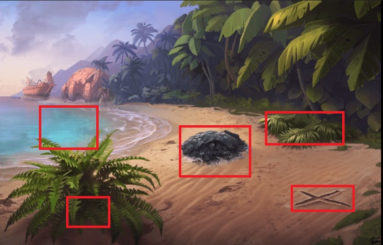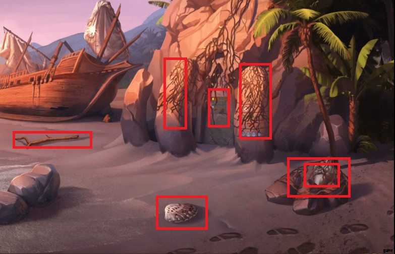 - 貝殻を滑らせる コインを集める 流木を集める 船の近く .両方のアイテムをインベントリに追加してください シーンの左側に移動して、さらにオブジェクトを表示します .